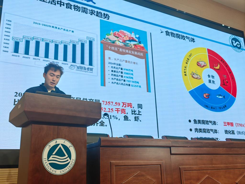 董祥瑞以《基于改性In2O3的三甲胺传感器及其鱼类腐败检测研究》为主题,详细介绍了围绕鱼类腐败检测核心需求展开的研究思路。他指出,鱼类腐败会释放三甲胺(TMA)有害气体,传统检测方法存在操作复杂、效率低等弊端,因此研发高性能TMA传感器具有重要现实意义。其研究采用静电纺丝法制备 In₂O₃纳米线,通过调控煅烧升温速率与退火温度对大黄鱼新鲜度进行监测实验,结果表明,该传感器凭借优异性能在鱼类检测领域前景广阔,未来将通过金属掺杂、双金属修饰等方式进一步优化性能,提升复杂环境适应性与检测精度。