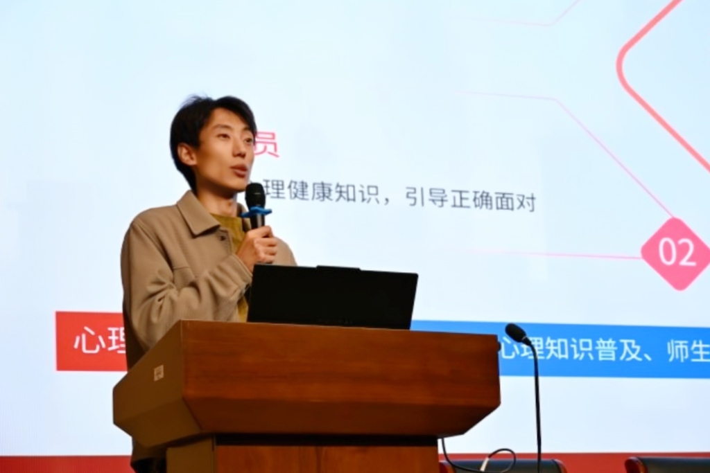 会上,谢幸福围绕“角色与使命、知识与技能、危机与处理、利他与利己”四大板块展开系统讲解。他用“观察者、支持者、宣传者、传讯者”四重身份,厘清心理委员“师生桥梁”与宿舍长“前沿哨兵”的职责边界,帮助同学快速完成岗位认知,并重点解析“消极情绪信号—异常行为信号—紧急危机信号”三级识别要点,帮助与会学生在学会识别的同时,正确做到早预警、早介入、早报告。 随后,他强调“利他与利己”的成长逻辑,鼓励同学们提高责任意识,主动担当作为,真诚帮助他人,实现个人价值实现与他人共同成长的善意循环 。